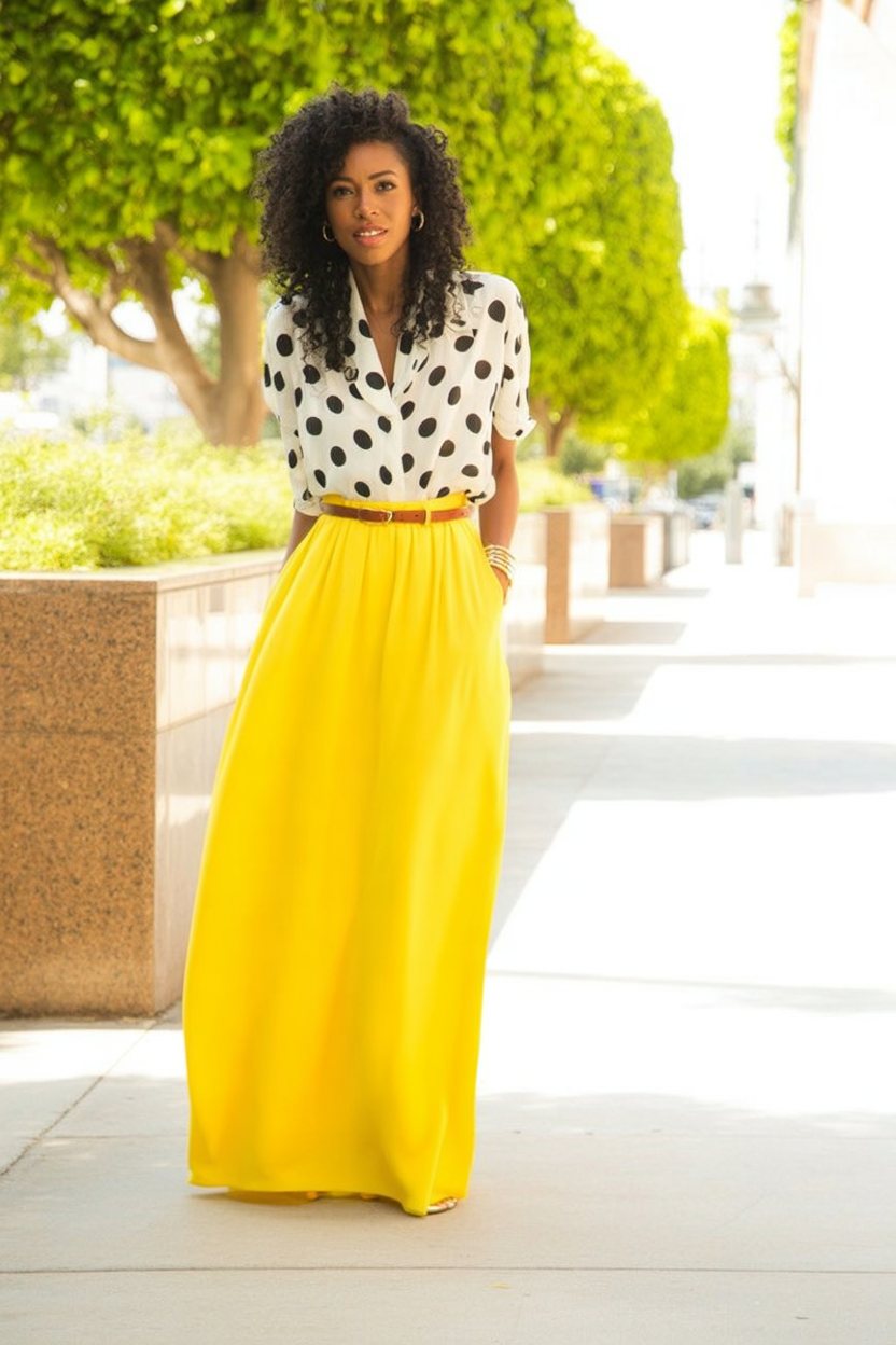 10. Polka Dot Blouse with Butter Maxi Skirt