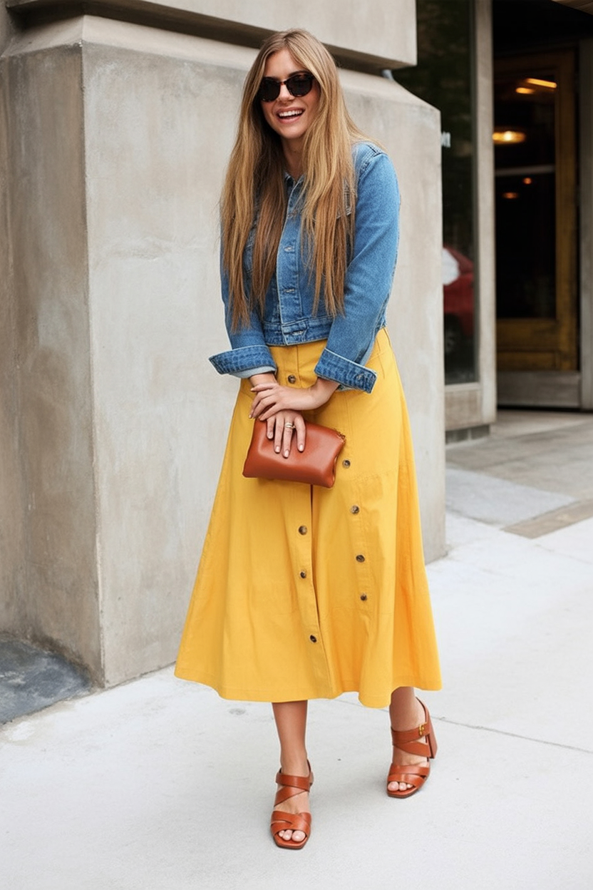 11. Denim Jacket with Button-Front Yellow Midi Skirt