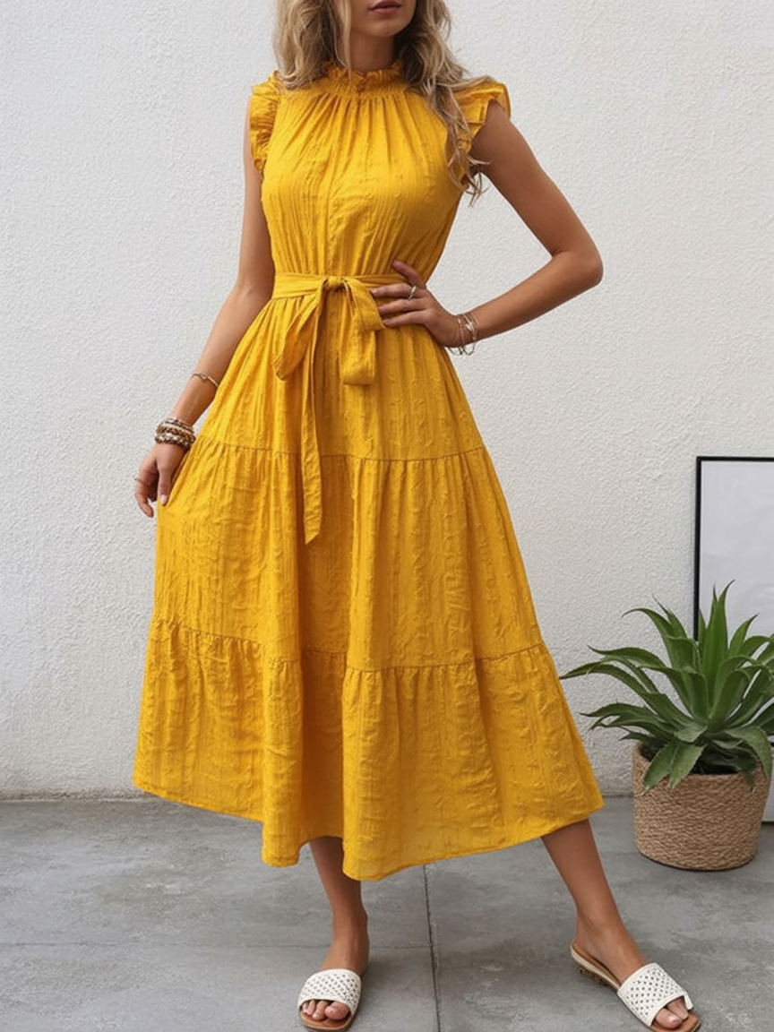 This tiered mustard dress looks like it was made for slow summer afternoons and long iced coffees. The high neckline and flutter sleeves keep things modest, while the tiers and waist tie give you movement and shape. It’s feminine without feeling precious—the kind of yellow outfit you can throw on and instantly feel a bit more put together. Minimal slides keep it grounded and casual—but add a red lip, and suddenly you’re ready for a dinner patio.