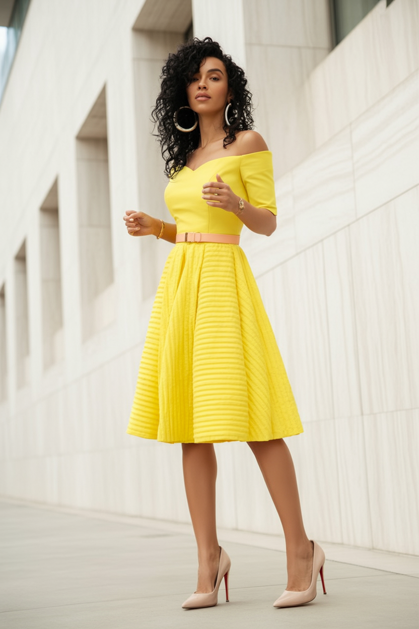 This off-shoulder yellow dress is pure confidence in clothing form. The fitted bodice and softly structured skirt create that classic hourglass shape, while the neckline shows just enough skin to feel flirty without crossing into “too much.” On Black women, this vivid shade lights up the complexion in the most gorgeous way, especially with curls and statement hoops. It’s the type of yellow outfit of 2026 that makes you walk a little taller, even if you’re just heading to lunch.