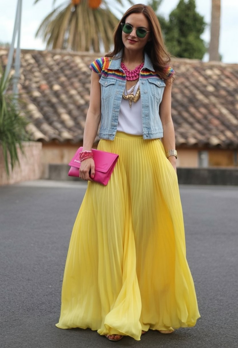 If you want your yellow outfit in 2026 to feel like pure joy, this pleated sunshine skirt is it. The movement of the fabric gives every step a little swish, while the denim vest and bright jewelry keep things fun and a touch boho. It’s the kind of look you wear to a rooftop brunch or summer festival and end up in half the photos because you just radiate light. The mix of casual layers with a dramatic skirt makes it feel effortless rather than “trying too hard.”