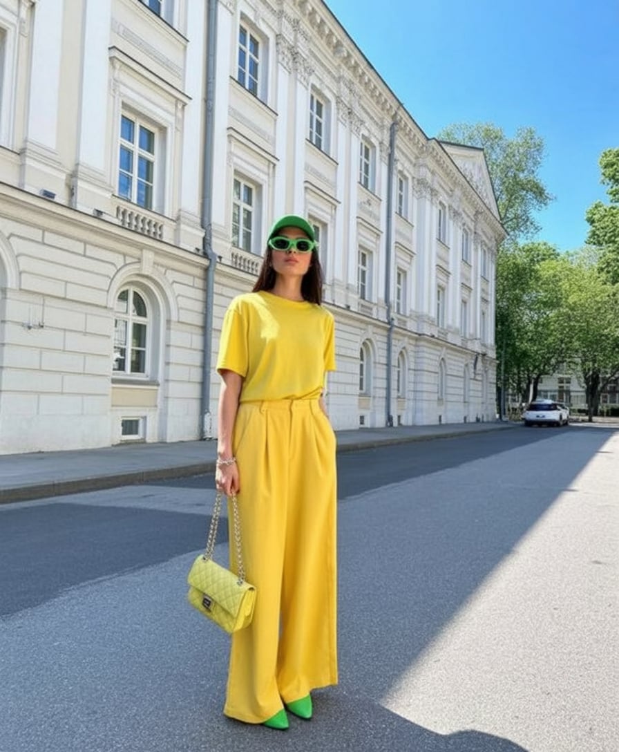 If you’ve ever wanted to try head-to-toe color, this monochrome yellow set is your sign. The easy tee and wide trousers create one long column, instantly lengthening your frame and giving that cool, minimalist aesthetic. Then the green cap, shoes, and sunglasses step in, turning the whole thing into a punchy blue-and-butter-inspired palette that looks straight off a street style shot. It’s bold, playful, and surprisingly wearable once you lean into it.