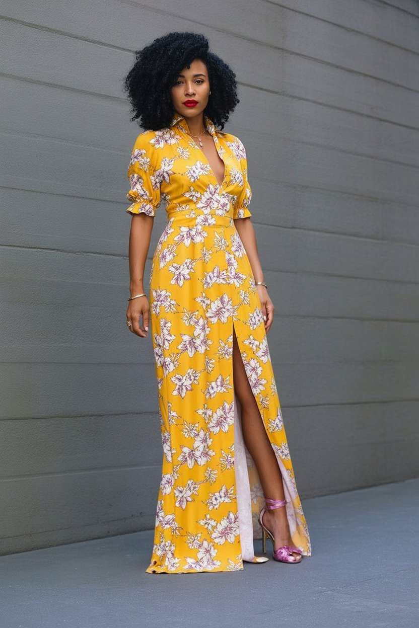 This floral maxi dress delivers full-on drama in the best possible way. The rich yellow base sets off the soft blossoms, while the front slit and defined waist keep the silhouette modern and flattering. On Black women, the contrast between the print and skin tone is absolutely stunning, especially with bold red lipstick. It’s the kind of yellow outfit of 2026 that makes you feel like the main character wherever you go.