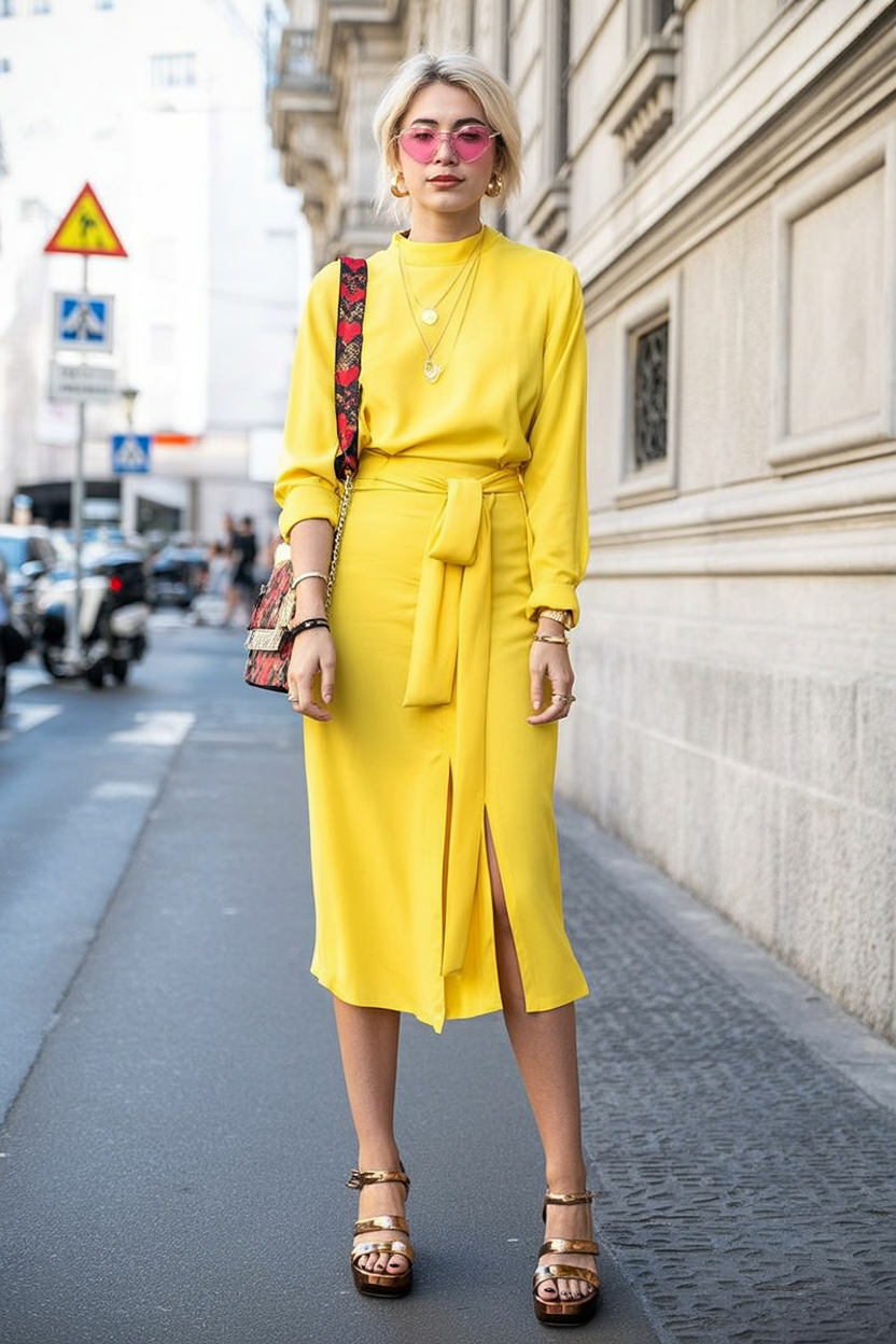 Sometimes the most powerful yellow outfit of 2026 is also the simplest. This sleek shift dress drapes effortlessly, skimming over the body and letting that buttery sheen catch the light as you move. Oversized earrings and retro sunglasses do all the heavy lifting in terms of drama, while strappy sandals and a tiny bag keep the look cohesive. It feels glamorous but not try-hard, like you just stepped out for an espresso and turned heads without meaning to.