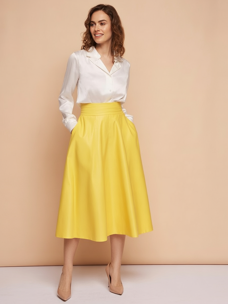 The emotional payoff here is big: you feel dressed up without being overdressed. The shirt keeps you covered and comfortable, while the skirt gives you that swishy, movie-moment movement with every step. Reach for this yellow 2026 outfit combo when you’re craving a confidence boost—presentation at work, birthday brunch, or first date. A bold lip, simple hoops, and a good laugh with friends are really the only accessories you need.