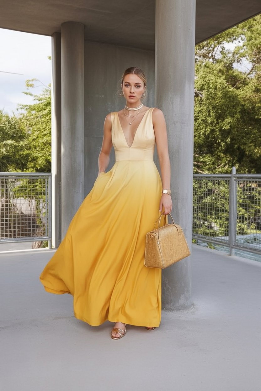 This ombre gown is a literal ray of sunshine, fading from soft butter at the bodice to deeper gold at the hem. The plunging neckline and full skirt create a sweeping, romantic shape that feels straight out of an old movie, but the color keeps it firmly in yellow outfit 2026 territory. It’s dramatic without being stiff, and when you walk, the fabric moves around you like light. Tiny layered necklaces and a structured bag keep it from feeling overly formal.