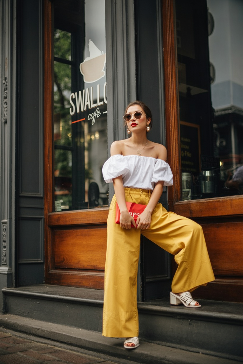 There’s something wonderfully dramatic about an off-shoulder white top paired with wide mustard trousers. It’s a little bit café in Paris, a little bit downtown street style, and completely perfect for a summer evening when you want to feel flirty but still grown-up. The relaxed volume of the pants balances the bare shoulders, so the outfit feels chic instead of revealing. Add a bright clutch and statement earrings, and suddenly your yellow 2026 outfit is ready for rooftop cocktails.