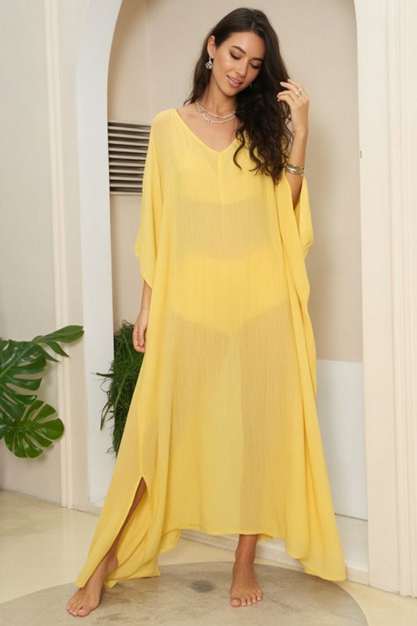 This sheer yellow kaftan is the definition of effortless glamour. It floats around the body like sunlight, with soft fabric that moves every time you breathe or laugh. It feels dreamy and a little bohemian but still polished enough that you could walk straight from the beach bar to a hotel lobby and feel perfectly dressed. This is a yellow outfit from 2026 that makes you want to slow down, kick off your shoes, and just enjoy being in your own skin for a minute.