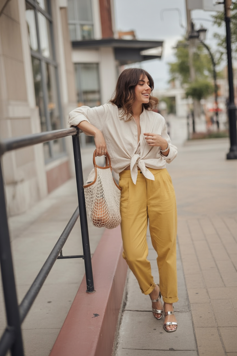Some days you want your yellow 2026 outfit to whisper instead of shout, and this look does exactly that. The soft, knotted neutral shirt feels relaxed and easy, while the mustard pants bring just enough color to keep things interesting. Rolled hems, simple metallic sandals, and a roomy tote make this perfect for errands, coffee dates, or casual Fridays. It’s comfortable without slipping into sloppy, and that’s a very sweet spot.