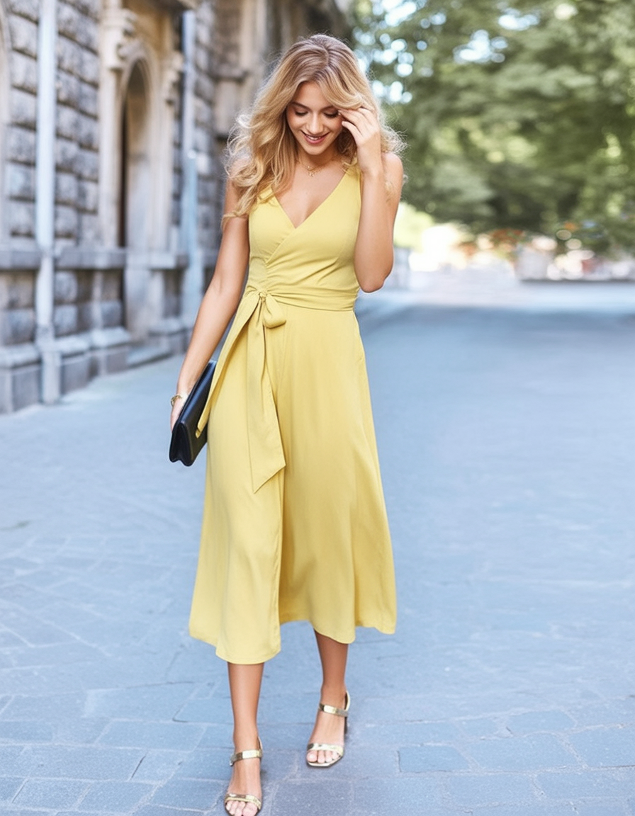 This wrap-style midi dress is that gentle, flattering shade of yellow you reach for when you want to look polished but not overdone. The V-neckline and tie waist highlight your shape without feeling tight, while the fluid skirt moves beautifully as you walk. Paired with simple gold sandals and a sleek clutch, it becomes an easy yellow outfit for 2026 that you can wear to brunch, christenings, or even a casual wedding. It whispers “put together” without shouting for attention.