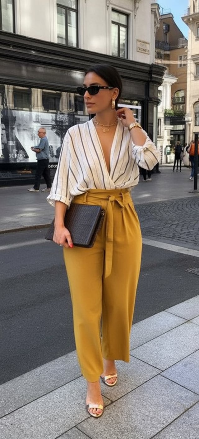 These mustard paper-bag trousers feel like the power move of yellow outfit 2026 dressing. The cinched waist and soft, fluid leg create a long, lean line, while the striped blouse keeps things sharp and modern. It’s that perfect mix of office-ready polish and after-work drinks energy, especially when you add angular sunglasses and a sleek clutch. The color is strong without shouting, giving you confidence in every step.
