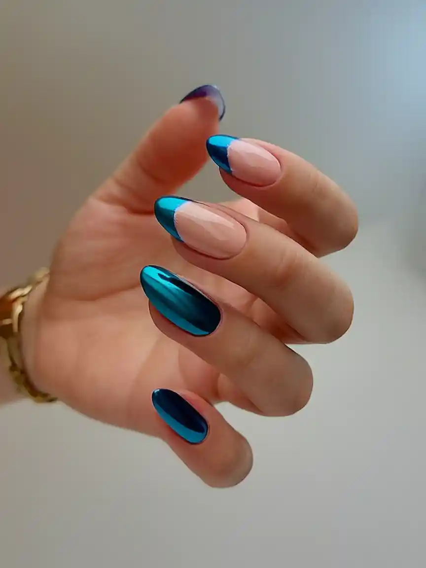 The style is futuristic glam perfection, a shimmering teal chrome plus a soft nude base, and a dark french tip twist. It emits self assured artistic tones that are ideal with the shifting vitality of fall 2025. The contrasted high-shine chrome of the base and minimalism is a power suit of the nail kind, slick, deliberate and entirely in control.
