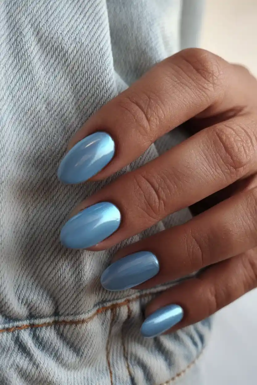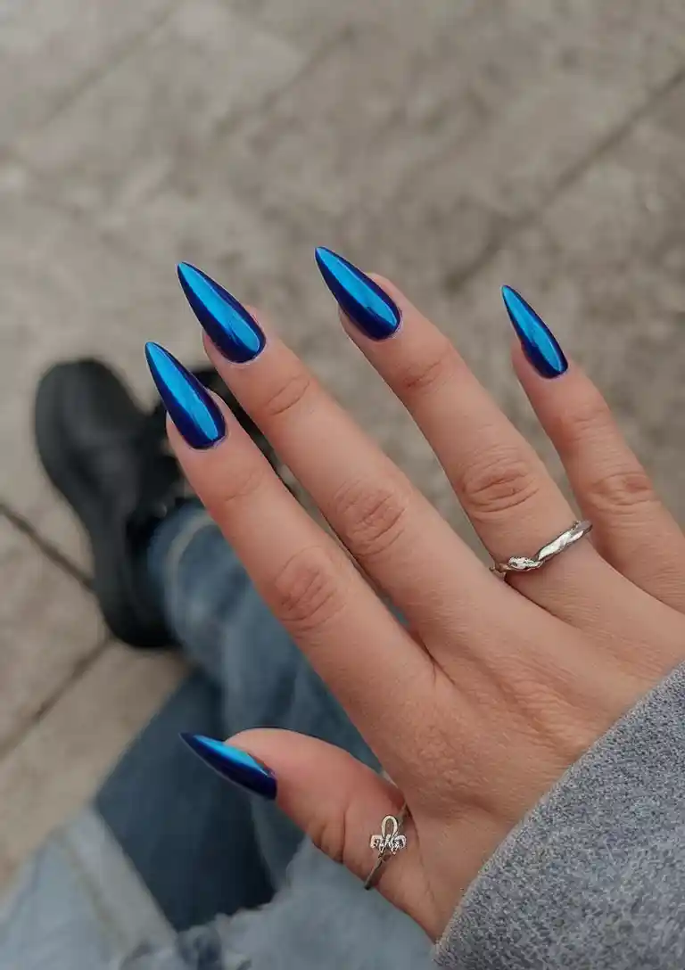 It is a blue chrome that almost glows like a fire enclosed in ice. The intense shine of the rich sapphire color makes the color electric, with the huge 2025 trend energy. It is dramatic, daring and a fancy way to shine this fall.