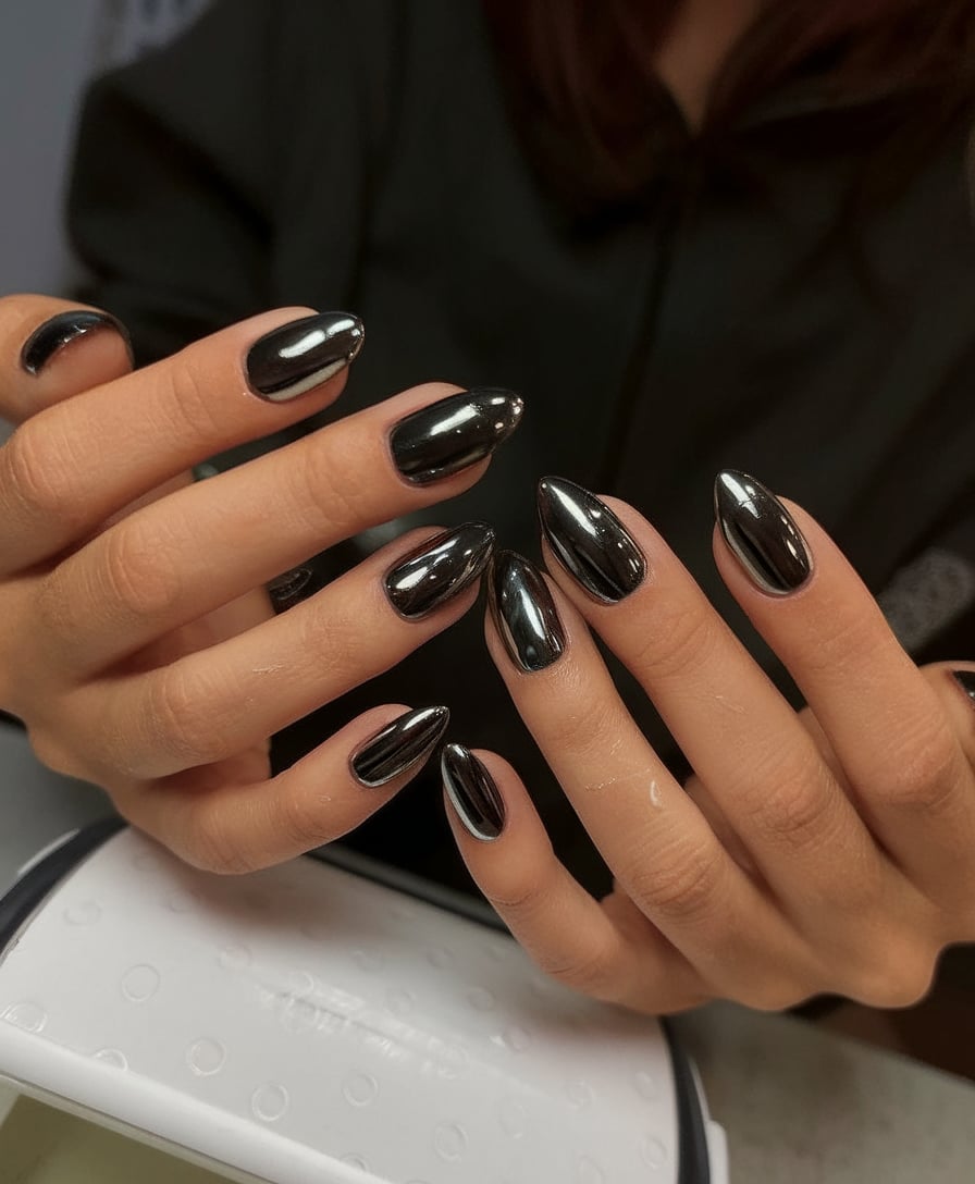 These are black chrome nails which look like a leather jacket on your nails it is edgy, strong and ultra cool. The finish is reflective that adds depth and makes the black nearly look liquid, such as obsidian stone. You should definitely try it as a fall trend of 2025 when you are in your moody girl stage.