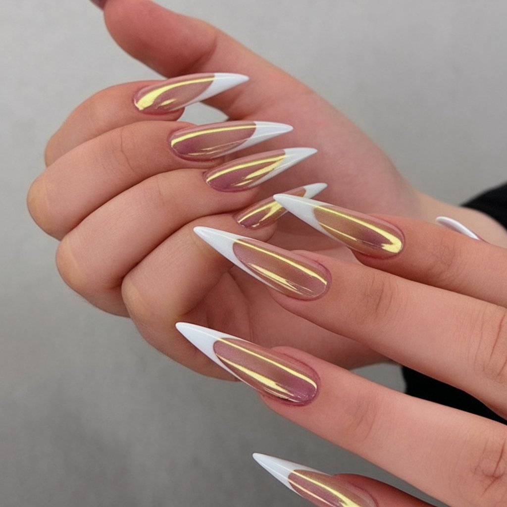 This dazzling french tip take is pure magic. The base is the soft golden chrome, which adds to the ethereal guide and tends to vary greatly at each movement of the hands, and the sharp accents made of white produce a dramatic almond frame. The impact is stunning, as though you are wearing the ray of autumn sunshine on your finger tips.