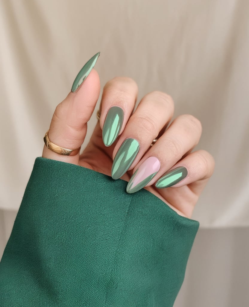 A surprise, but a timely fresh one, this chrome green is soft and takes cues to the changing colors of fall in 2025. The touch of the neutral pink nail in the accent creates a nice contrast that makes things modern and entertaining.