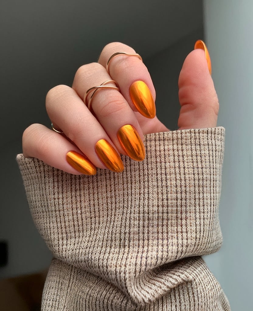 In case your fall mood board encompasses magic woodlands and night-time strolls in the moonlight, then this glass-like iridescent beetle nail design is your look. The mixture of green, purple and bronze notes in chrome looks trancing and mystic as a magic dip in fallen leaf.