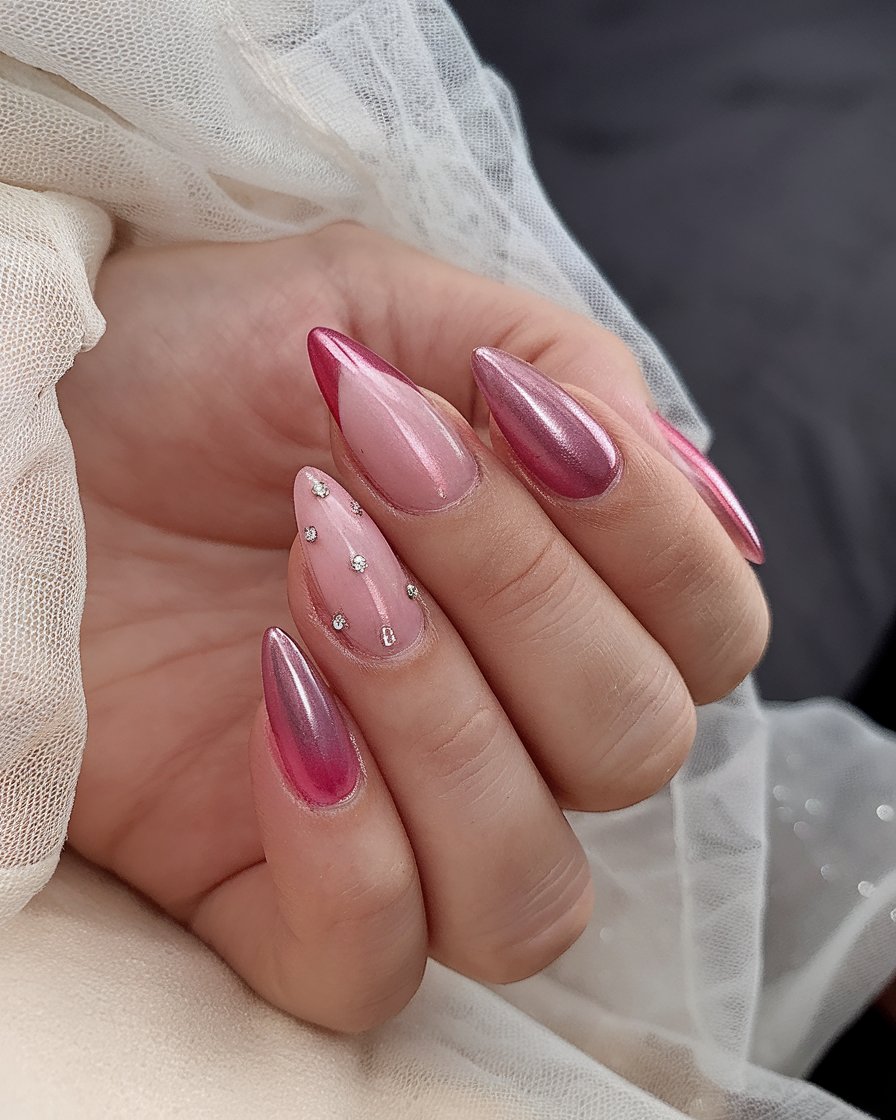 Modern, and sentimental, this style has the shade of pink chrome turned into mild ombr support with one accent eye worthy of a few shining rhinestones. It is feminine and futuristic at the same time, as though this is what they will wear on a dreamy fashion week runway in 2025.