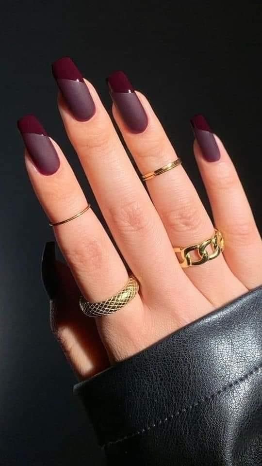 These matte deep burgundy nails are so simply gorgeous. It comes with a subtle diagonal gloss accent that provides a refined contrast, and thus can be described as ideal for a clean evening out, i.e. a bold red lipstick on your fingers. The mood is confident, sultry, and undeniably sophisticated.