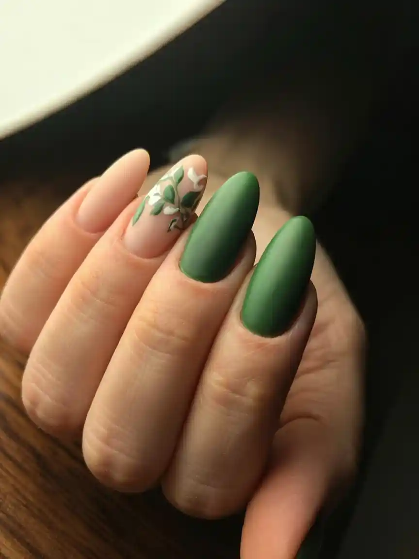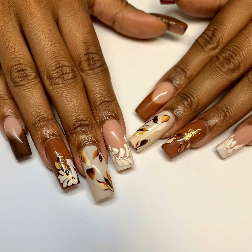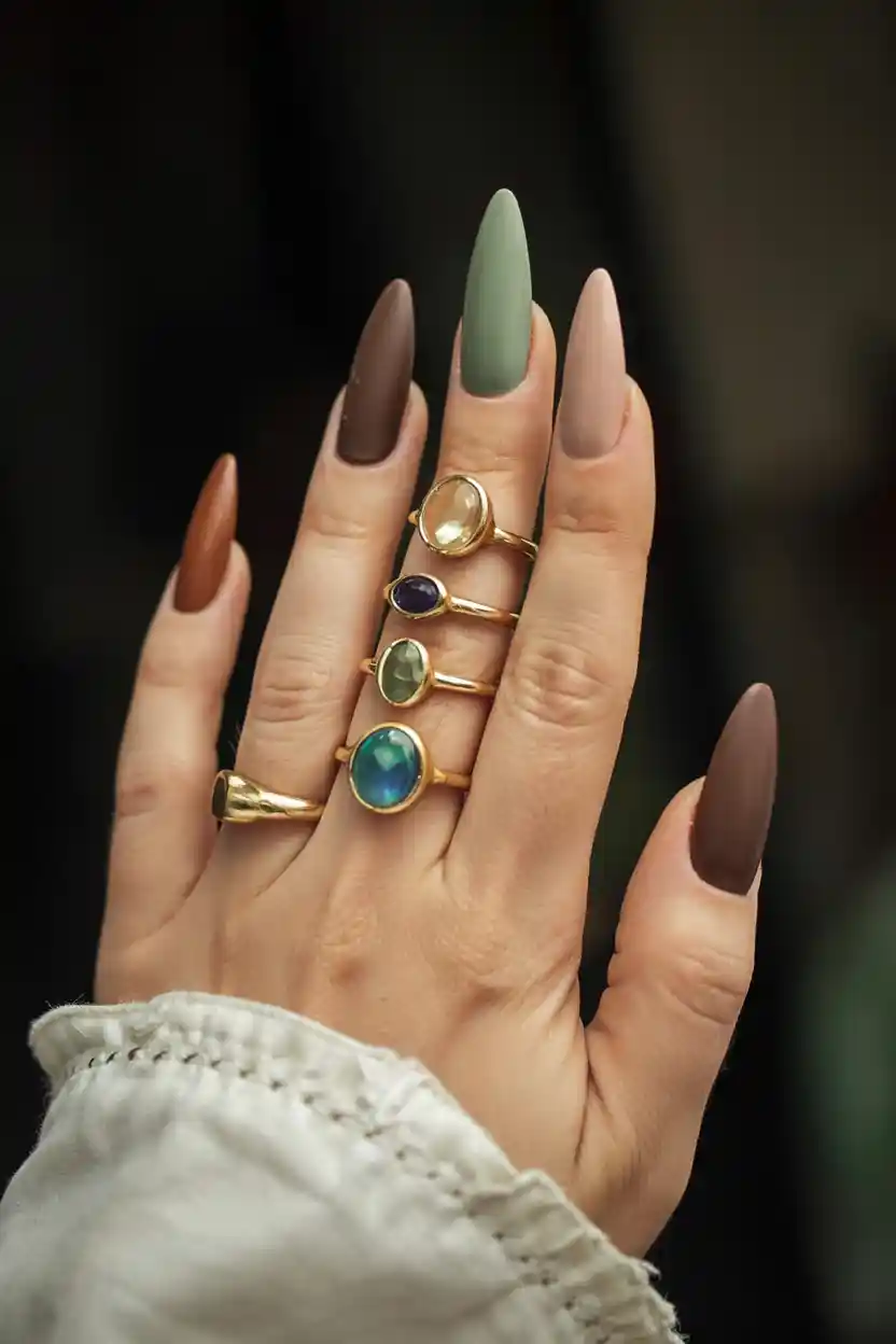 Dark and brooding in the most classy fashion, these matte nails are inspired by the calmness of the forest dark brown, soft clay, sage green, and warm beige mix to form a natural and worn fall color scheme.