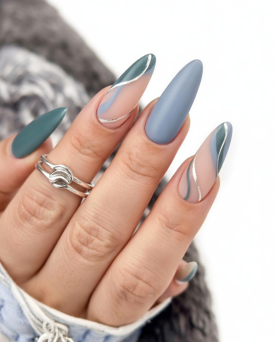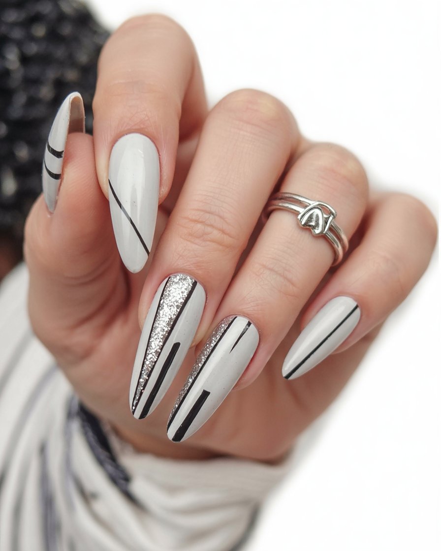 This set is perfect in case one wants to pursue a higher minimalist design, almond shapes and mid-length nails look great with this set. Install a metallic liner or nail tape as that fluid silver touch, maybe a 2025 upgrade on the traditional cool tones.
