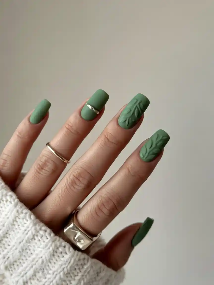 A serene assurance exists with this monochrome olive green design. It looks solid and earthy because it has matte finish, and the raised structure of a leaf adds discreet beauty that is ideal for sweaters.