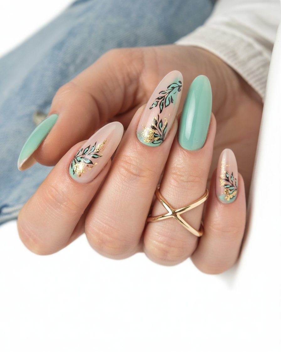 The design resembles a crazily pressed flower journal turned manicure. This contrast of clear matte bases, gold foil, and ethereal botanicals to solid aqua is both fun and lyrical.