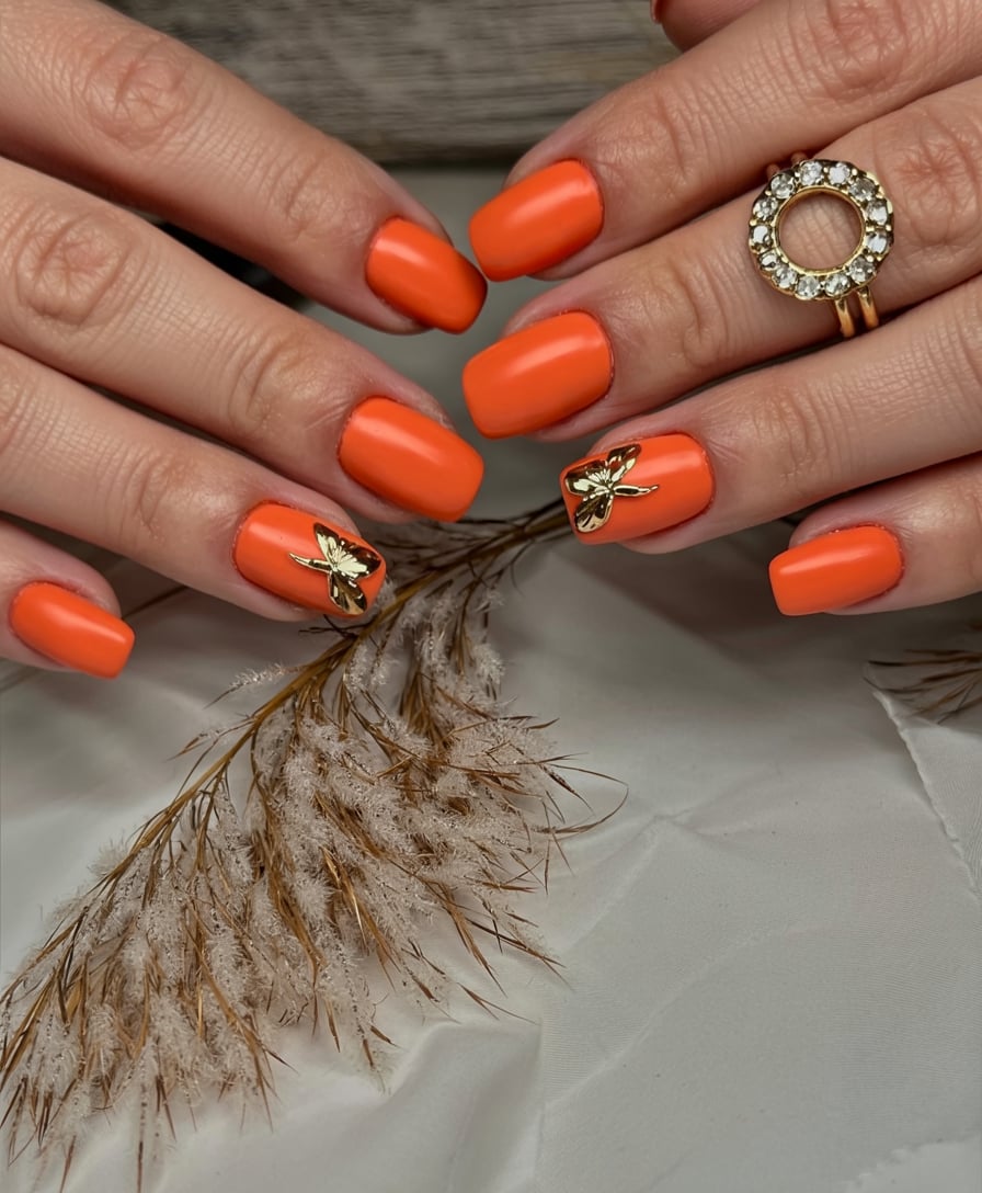 Hello, statement manicure! They are bright, festive, filled with small pieces of gold pumpkins, and are matte orange in colour, which makes them look like a photo opportunity in a pumpkin patch that you can wear on your nails.