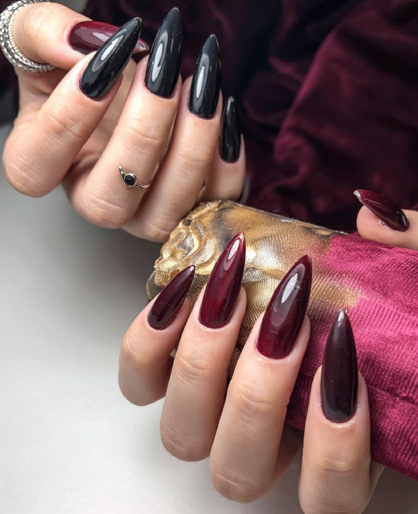 Drama and daring this will go all out between matte and shiny finishes as well. Nail stripes are broken up brilliantly between burgundy and black shades, creating an equally balanced outfit on your mani.