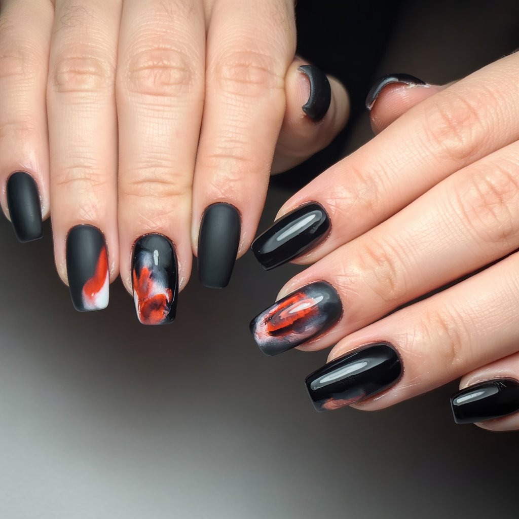 This pattern looks amazing on coffin/square shaped designs and suits almost every skin tonal color. The deep colors short makes it a very good alternative against black and at the same time being in season. Extra: matte top coats work to seal this design to make it last long.