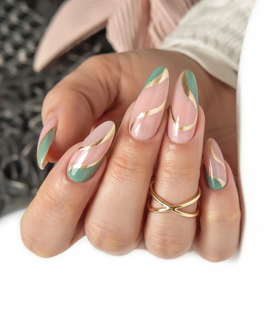 These gentle olive green swirls with glitter outline create calm elegance with the little bit of shine. Neutral matte tones bring it home, and the glitter brings it a fresh and feminine touch – it is a bit fancy, but it is also worn.