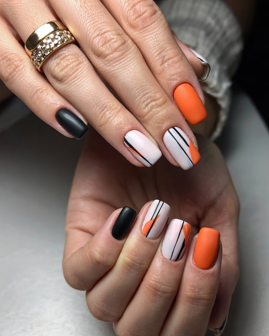 Graphic, bold, and very personal -these matte nails are a cheerful idea of the autumn creativism. The combination of vivid orange, black, and crisp vertical lines intersect with soft white, and we like the effect as much as we can say: it looks like giving “mod meets Halloween” — and we love it.