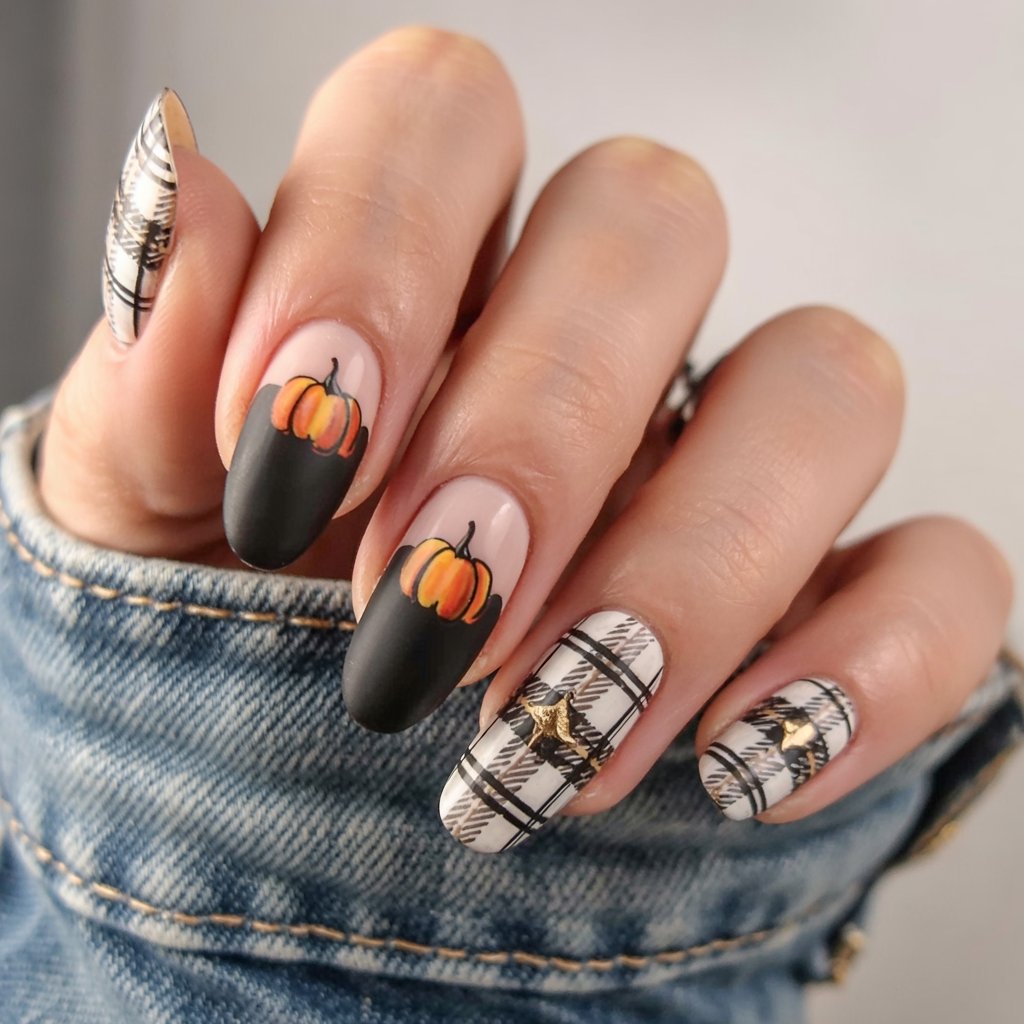 Such a design will work perfectly with ideas autumn nails that are not costume-like. The blend of black matte tips, pumpkin art, and plaid prints printed plaid combo will best suit longer lengths to make your nails look playful and think at the same time fall 2025.