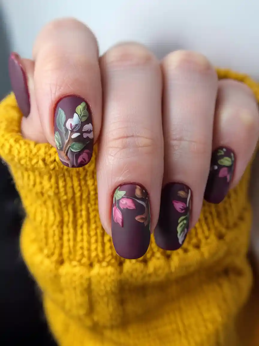5. Mauve Matte Nails With Hand-Painted Leaves