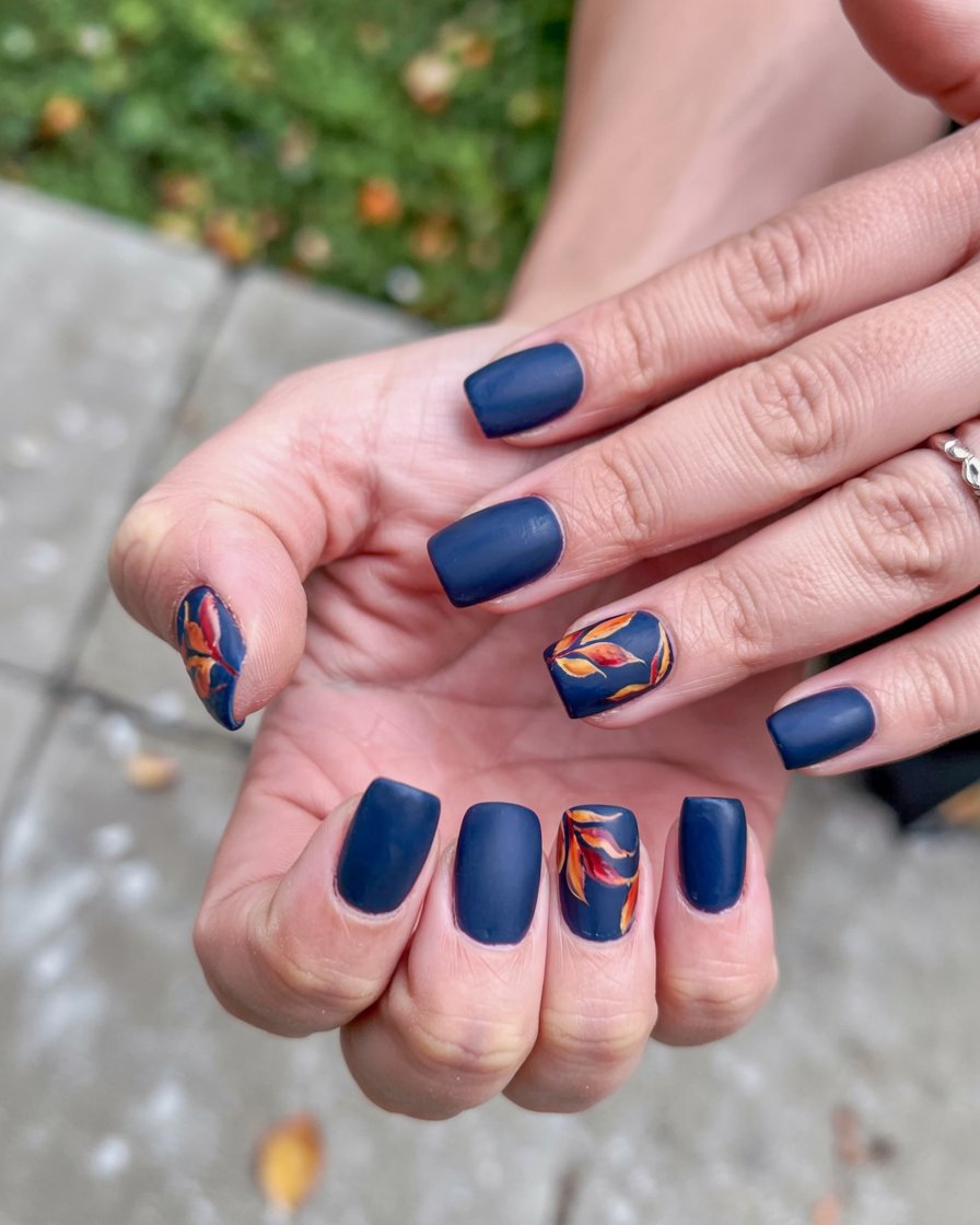 Sky-scraping but still classic, these navy matte nails are coated with impressive accents of orange and red leaves. It is the ideal combination of gloomy and luscious one, such as the twilight skies and the crisp fallen foliage.