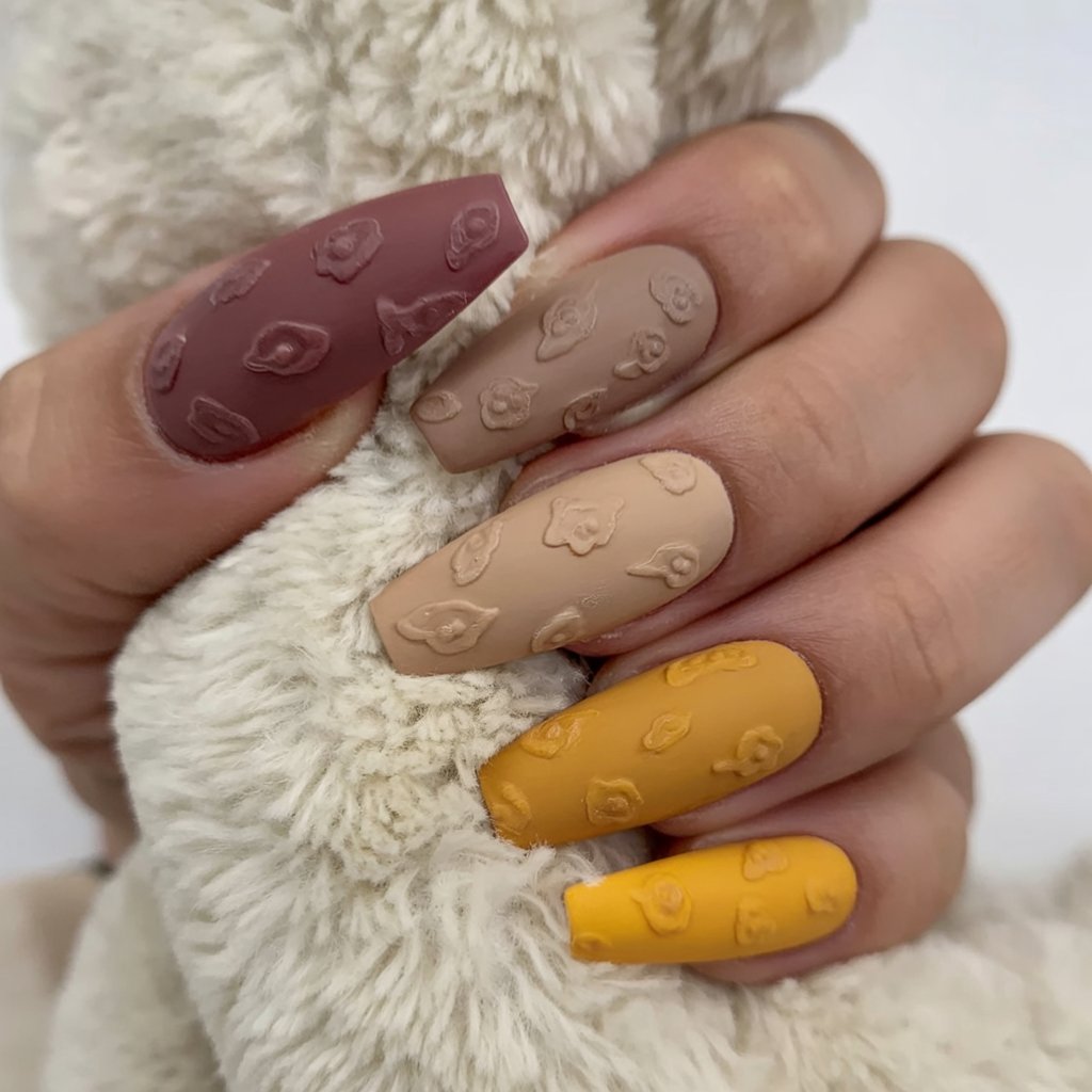 This is one of those looks that are perfect on shorter and square nails but offer ultimate autumn vibes without doing anything special. This year the 3D charms are in fashion, but the colors short provide a sure bet to warm cardigans and cappuccinos with cinnamon.