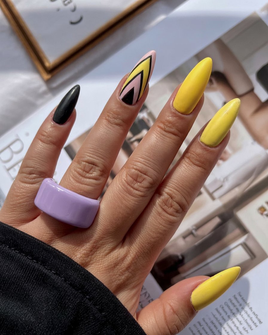These nails are most suitable to the people who want to make their manicure make a statement. The form is stylish and daring and looks fantastic on almond or stiletto shapes, as the design draws on your taste to wear bold colors and have a graphic contrast.