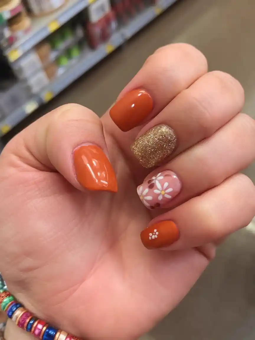 This expression reminds of the sun rays passing through the falling leaves-warm, bright and nostalgic. There is a leavesweet kick, the small daisies play a fun game popping out on deep orange nails. It’s giving happy hour at the pumpkin patch.