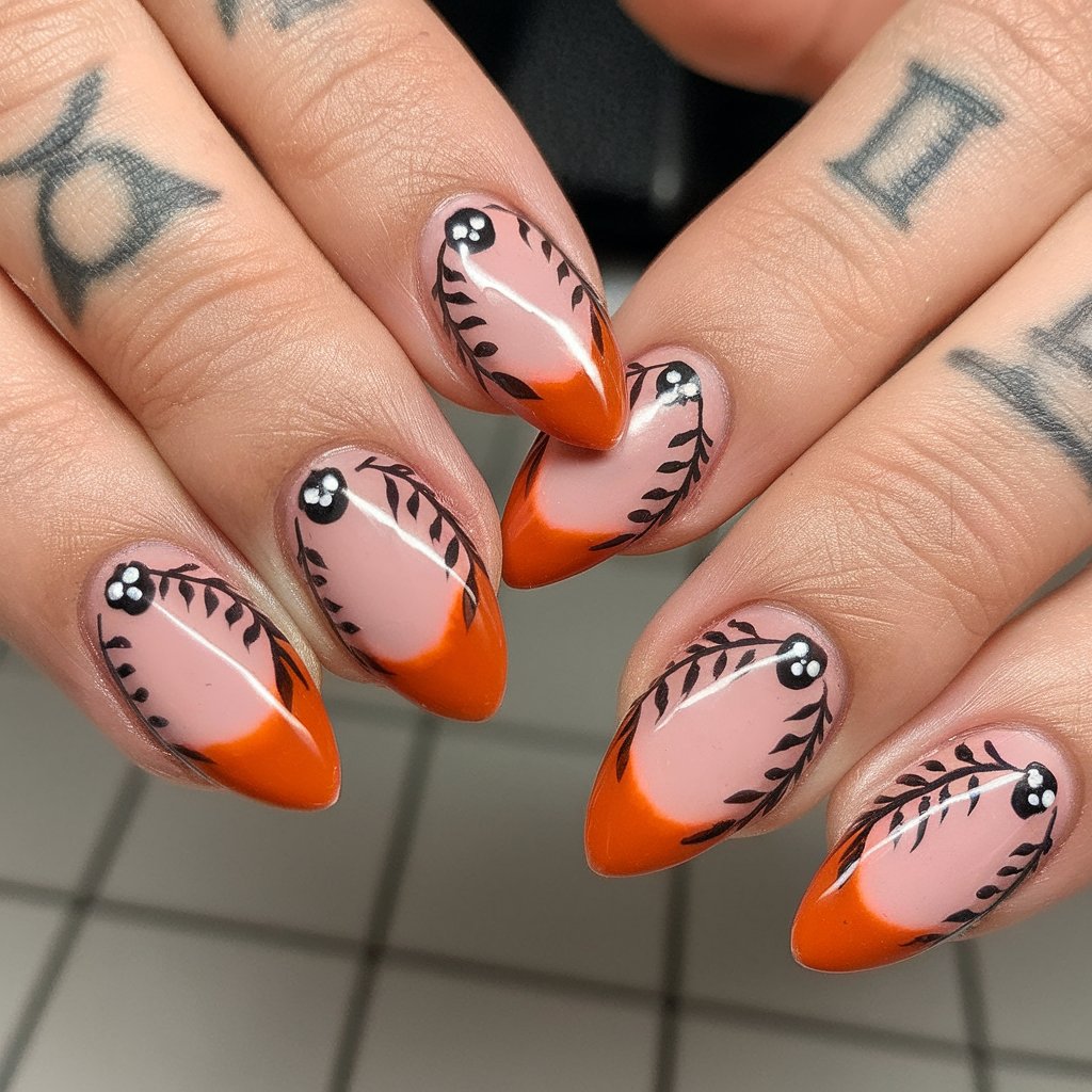 Decorated with the color of orange and having the French tip twist, this teaching is embellished with some fine details of black leaves and the tiniest flowers. It is sexy, playful, and seriously seasonal, but not opulent.