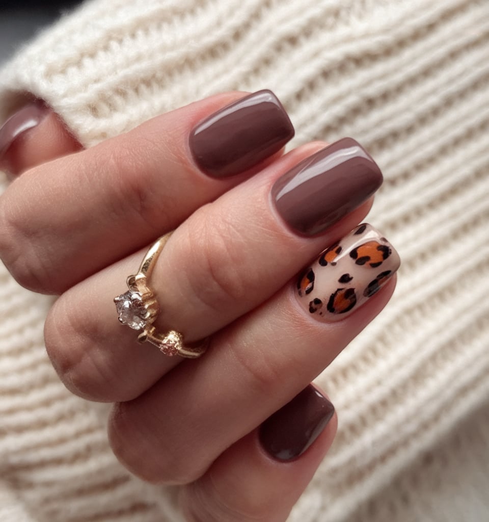 Brown cocoa polish is complemented with the glimpse of leopard print in the most comfortable, fashionable outfit. It PSL of nail looks warm, cozy, and on trend year after year.