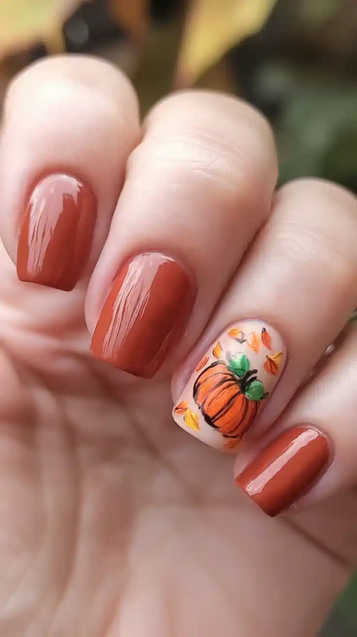 These fancy terra-cotta nails are the PSL of fall manicures basically warm, comfortable and familiar. The accent nail has pumpkin art that acts like a petite masterpiece to add a quirky touch to an otherwise plain appearance. One only has to look at them to hear the sound of the crunch of leaves under the boots.