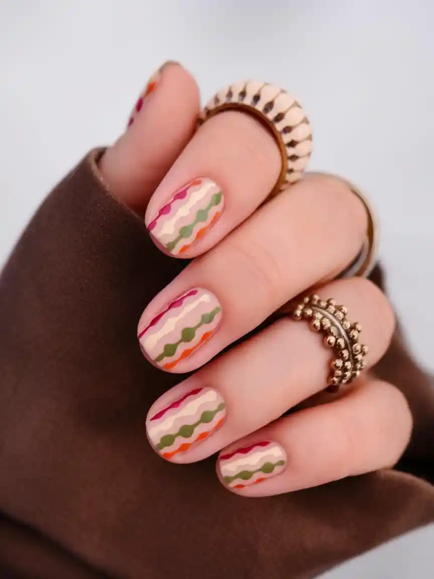 These wavy stripes have something playful and retro about them- it is retro sweater weather day but it is on nails. The hue combination of olive, berry, peach, and light beige is very cozy, sentimental, and groovy to wear in the fall.