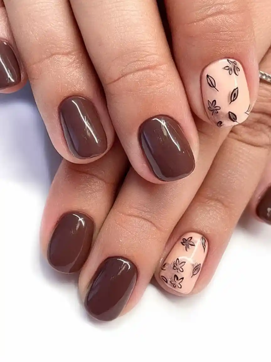 It is a traditional look with an edge that feature five nails in deep cocoa brown color with the accent nail in soft beige color with hand-drawn leaves. It is sweet, down-to-earth, and wouldgood on a fall Pinterest board.