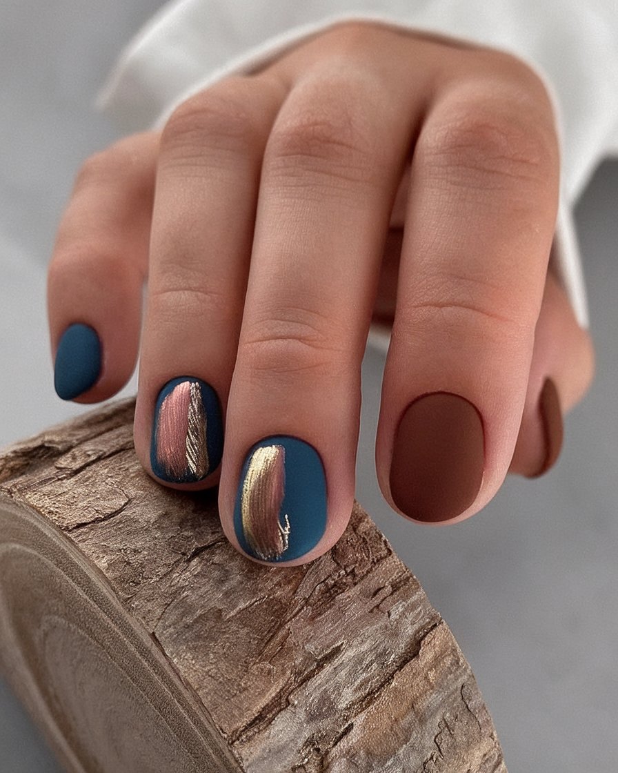 People call this grumpy saturated teal moody matte teal, and a metallic magic twist to this is surprising since there are big bronze brushstrokes that have been affixed over two accent nails. It is the art of the day in the shape of a mani: cool, abstract, and far fall-forward.