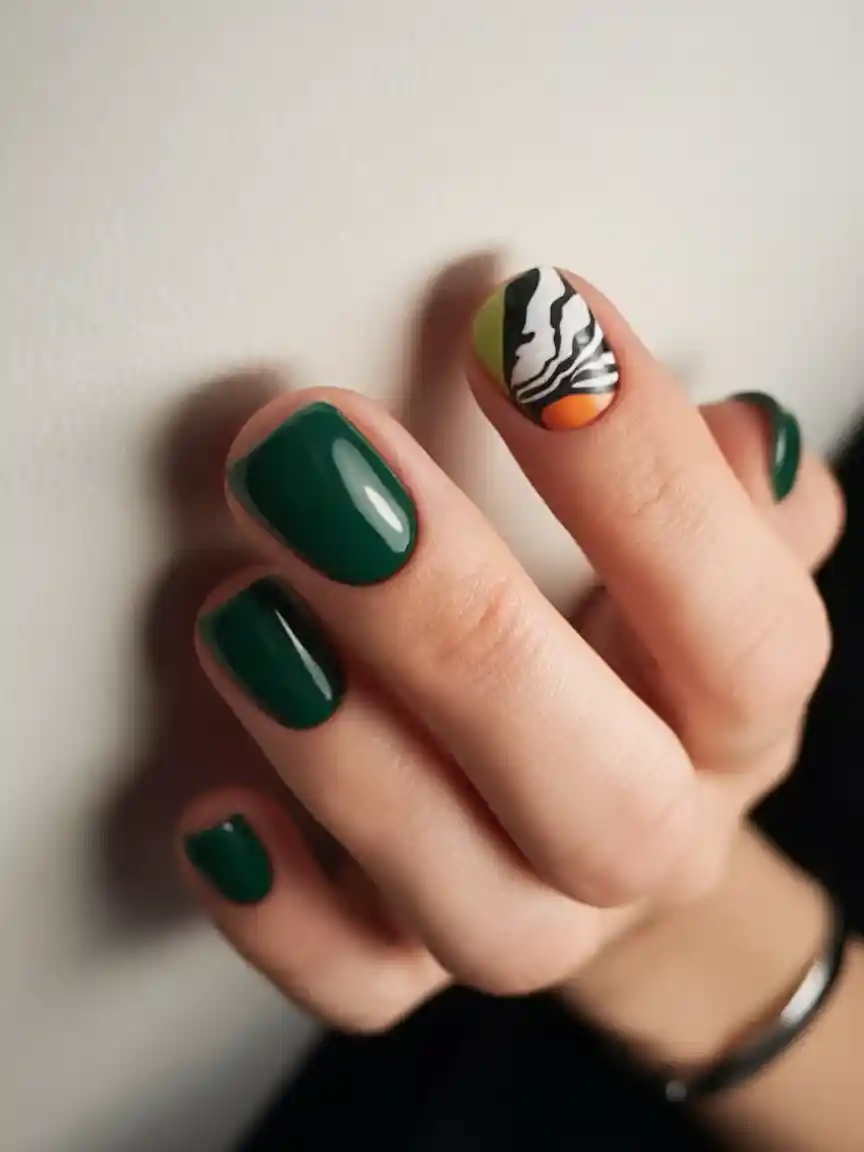 Dark green nails are the no-nonsense-type nails and when you add a bit of cheekiness in the form of a zebra print with an injection of orange? Suddenly, it’s a whole vibe shift. This dress toes the boundary between elegant and grunge without breaking a sweat.