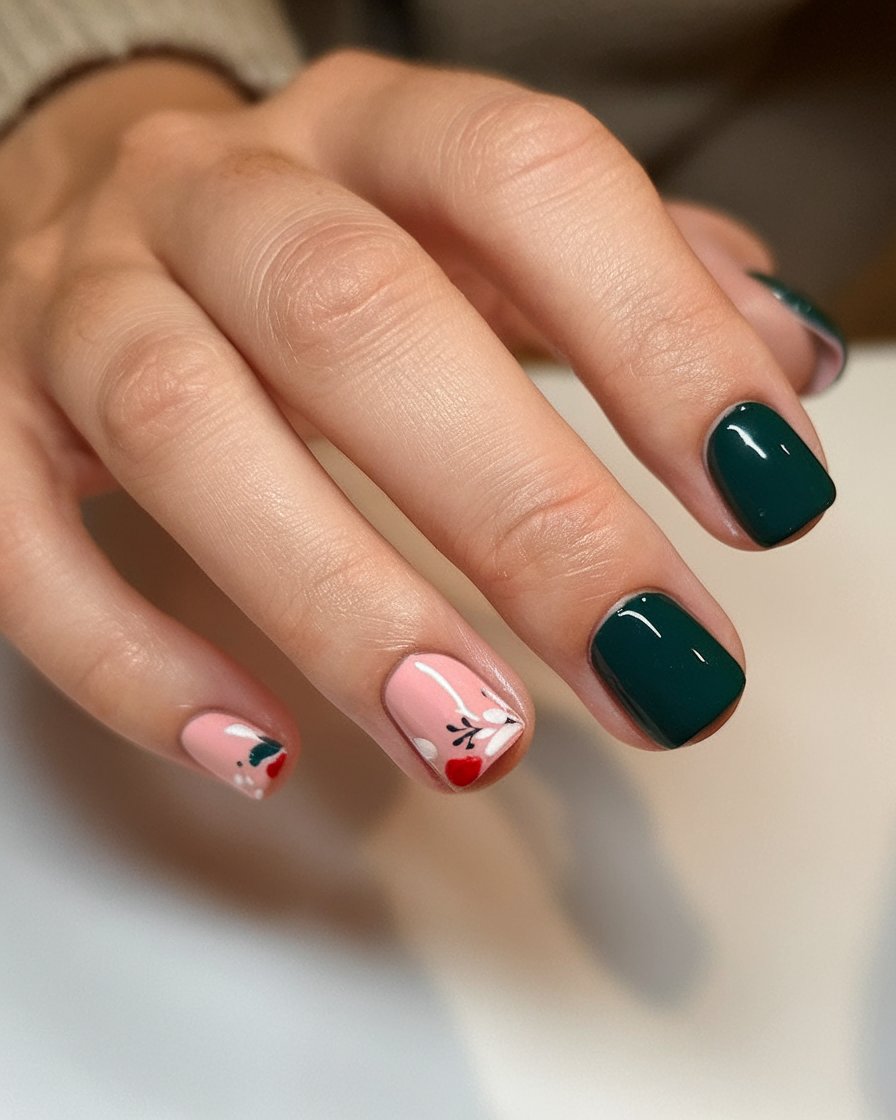 This is the right wink in case you love minimalistic 2025 nail arts. The deep glossy green gives it some depth and the pink art makes it light and easy to approach. It is particularly complementary with short square nails, and it is insanely complementary with warm-colored sweaters or gold jewelry.