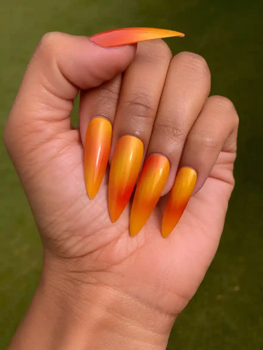 This fiery ombré manicure brings out the warmth of the season in the most stylish way. The stiletto-shaped nails blend deep amber, golden yellow, and burnt orange tones, creating a glowing gradient that mimics a fall sunset. The high-shine finish keeps the look polished and fresh while still feeling bold and expressive.