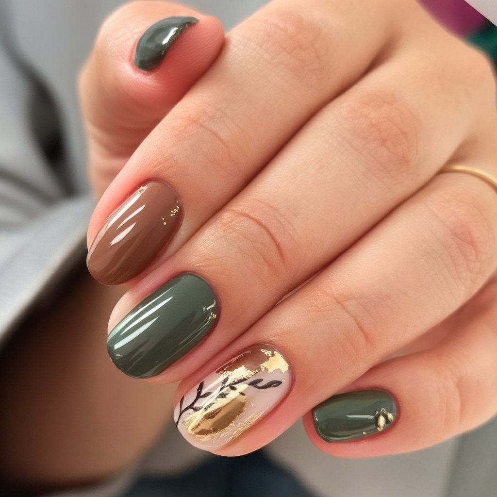 This look is autumn wrapped in elegance. It is the shade of a deep-green color combined with soft-brown shade and a beautiful gold foil embellishment reminiscing the experience of having a matcha latte in a knit sweater. The black detail on the hand painted branch over nude polish is the perfect balance of art without being too much on the design.