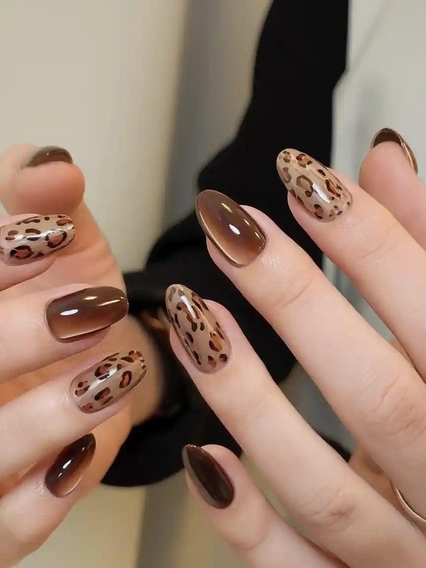Fall just got fierce. This is an edgy yet classic leopard-print manicure with warm browns, yet with transparent caramel shades, this design is up-to-date yet not extreme. Its leopard print offers it that funky, wild flavor and is a must have to those who possess cartwheel queen within them.