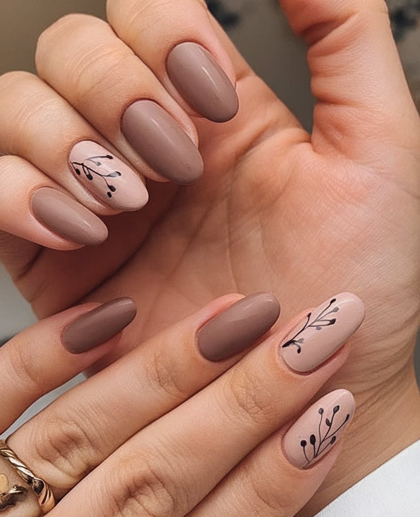 It is a delicious soft matte in taupe and blush, which has something intensely soothing about it. This art gives the minimum detail in the form of black branch painting that makes the nails to have a touch of nature and seasonality without getting obnoxious. It’s the nail equivalent of your favorite autumn mug.